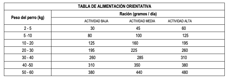 Ponga el alimento en el comedero dejando siempre agua limpia y fresca a disposición. Si realiza algún cambio de alimentación que sea paulatino y progresivo a lo largo de 7 días, para evitar desórdenes intestinales. Mantener el envase bien cerrado en un lugar fresco y seco, lejos del suelo y de la luz directa del sol. No apto para consumo humano. (Ver tabla orientativa).