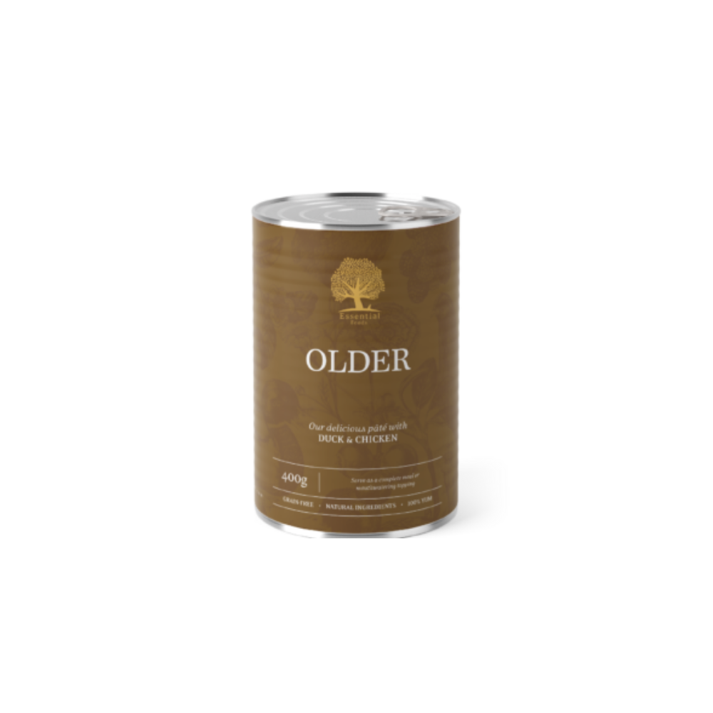 Essential Older Pate es nuestro delicioso paté hecho con trozos de carne de pato y pollo adaptado a las necesidades de los perros mayores. Una deliciosa comida o aderezo para comer solo. Además, permite una digestión suave, que suele ser apreciada por los perros mayores.