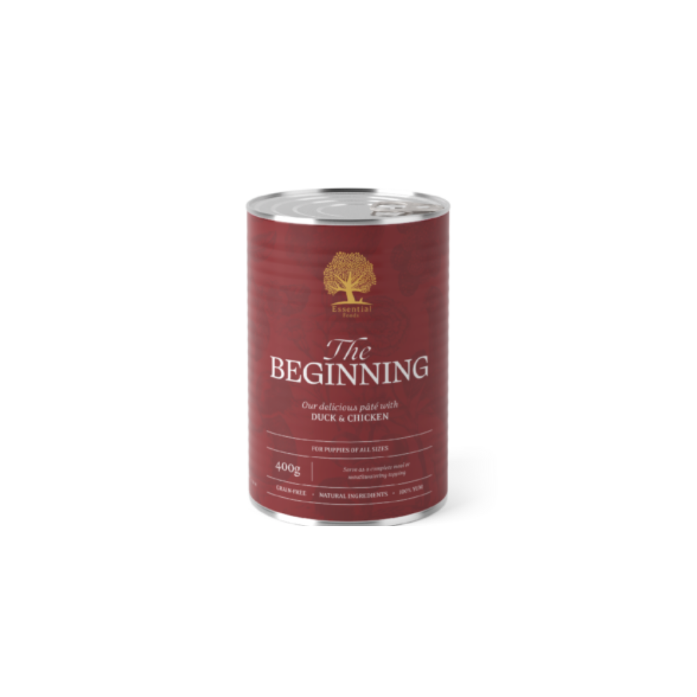 Essential The Beginning Pate es nuestro delicioso paté hecho con trozos de carne de pato y pollo. Una comida completa o un aderezo celestial para cachorros de todas las razas y tamaños. Si has estado buscando algo para despertar la emoción desde una edad temprana, ¡has venido al lugar correcto!